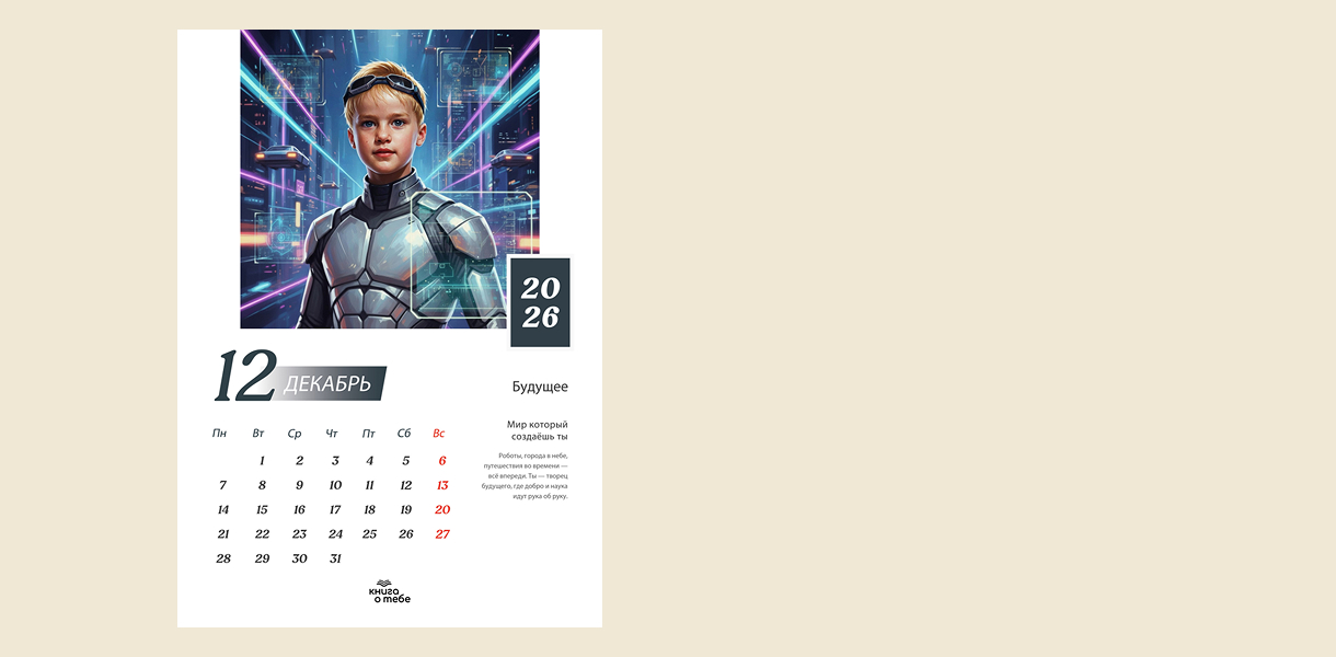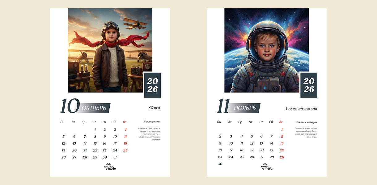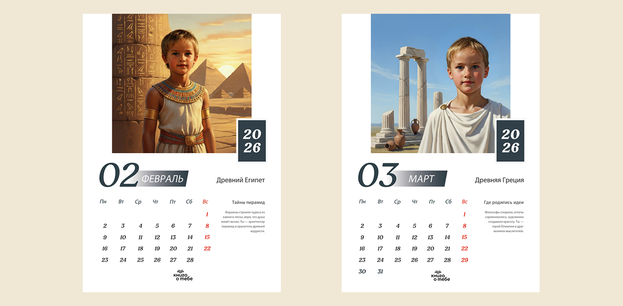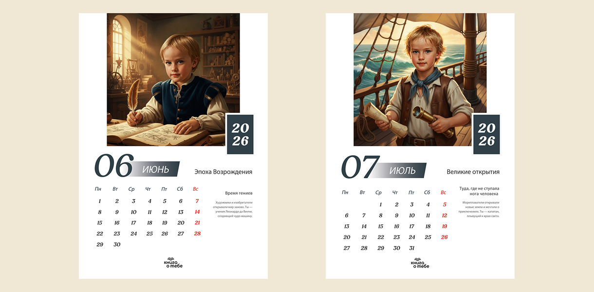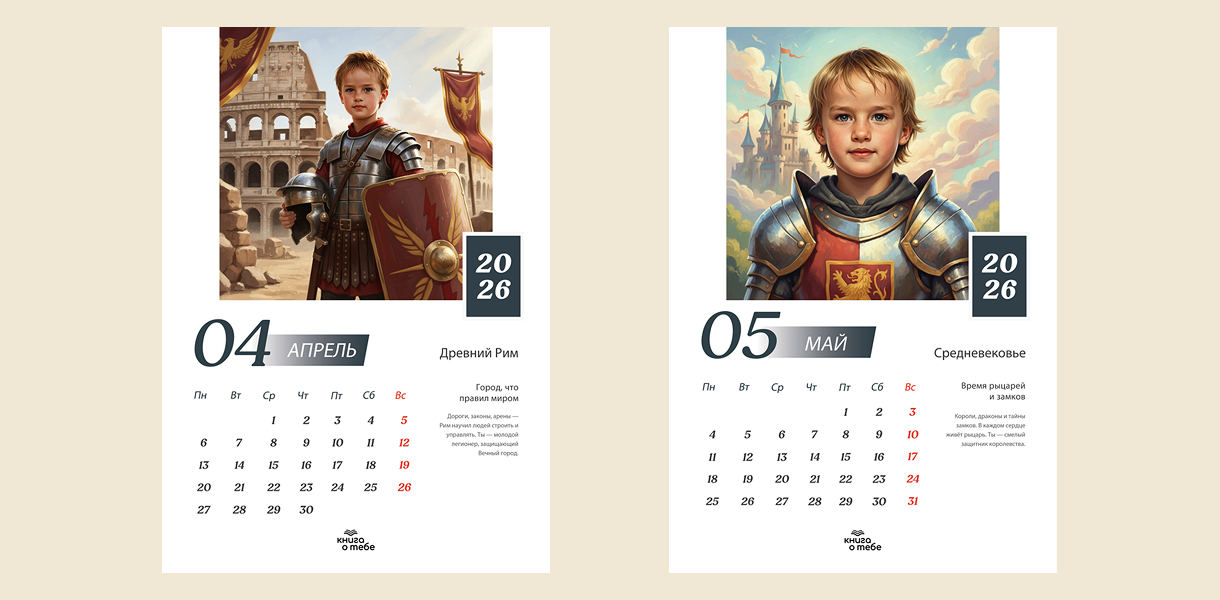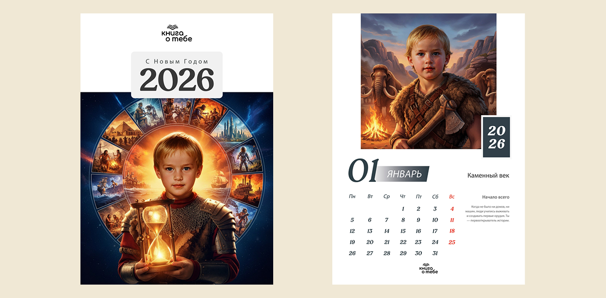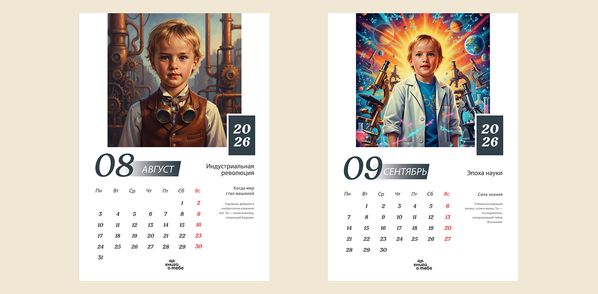«Исторический календарь на 2026 год» — это персонализированный календарь, на страницах которого ваш ребенок пройдет сквозь великие эпохи и станет героем истории. Этот календарь на 2026 год станет идеальным подарком, вдохновляющим на открытия, мечты и великие дела!
