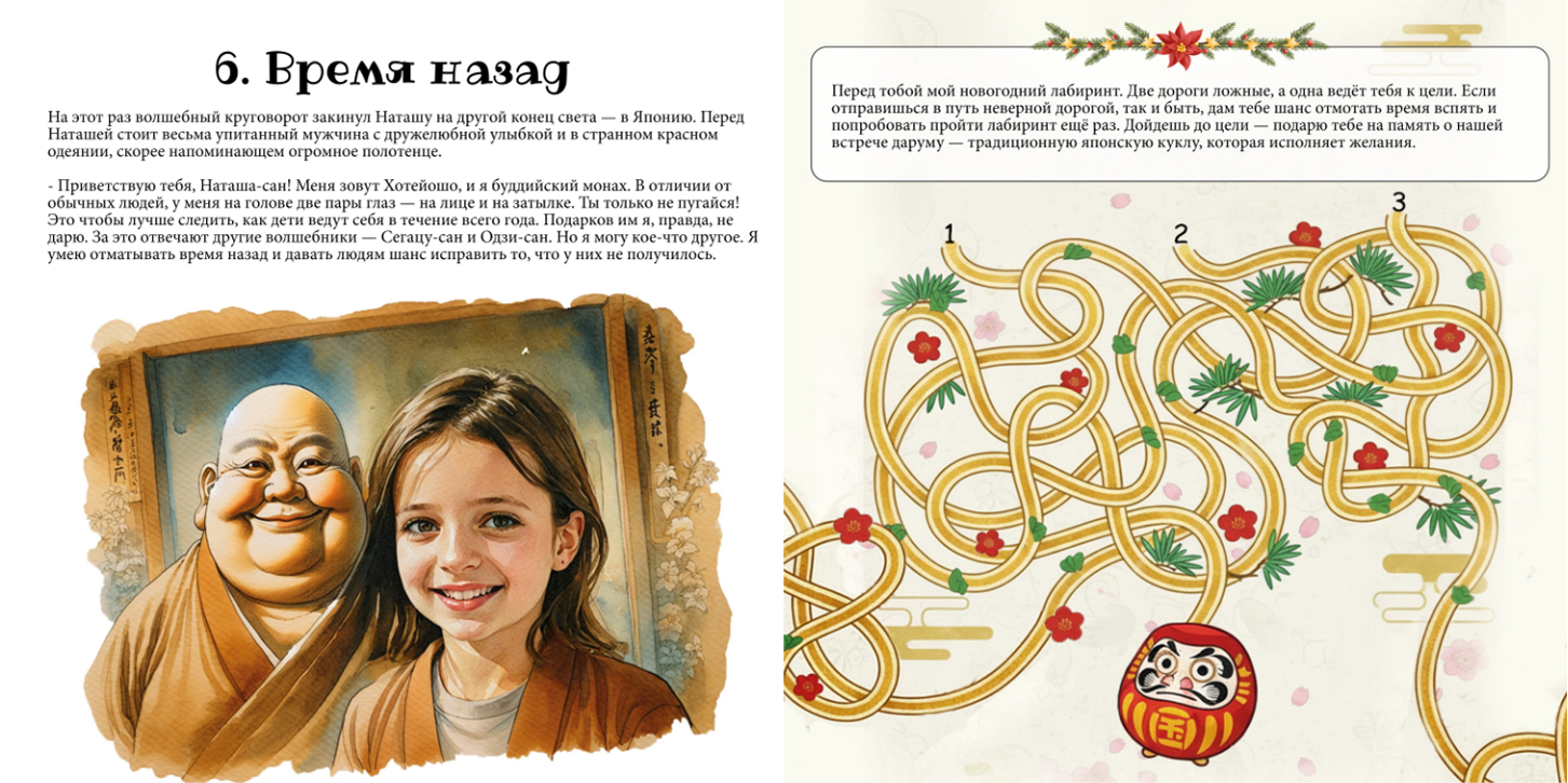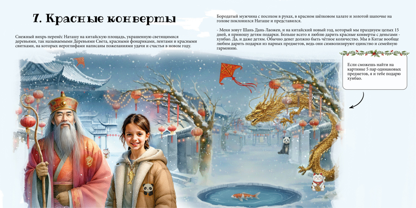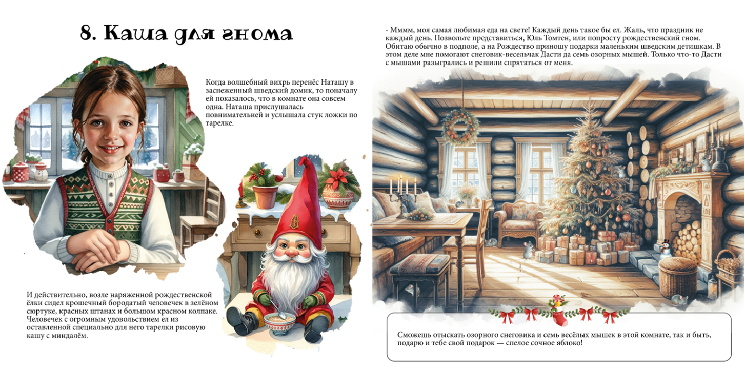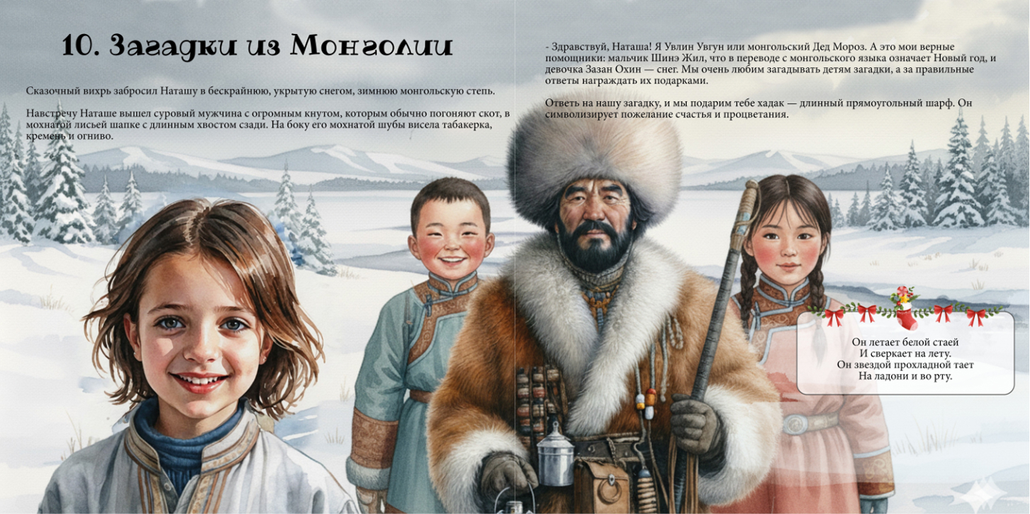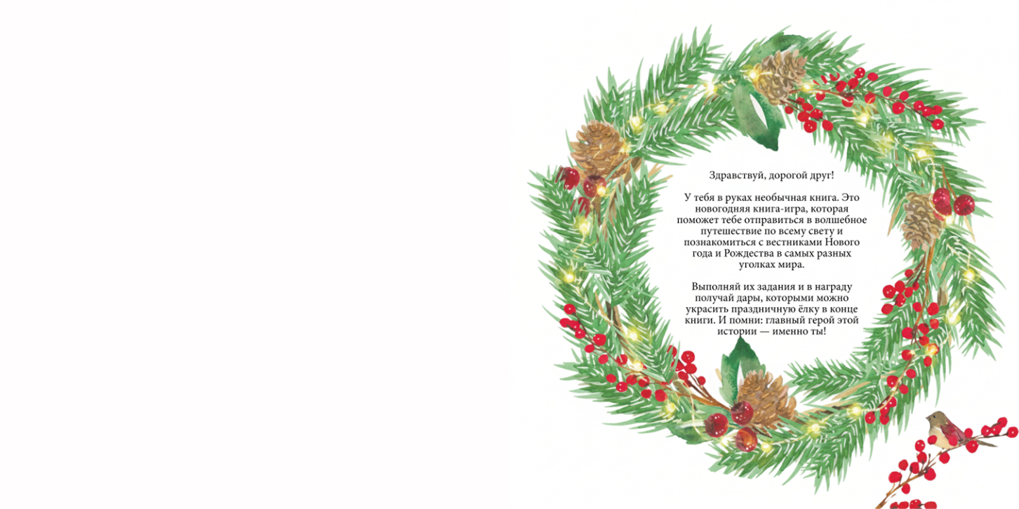 «Новогодняя книга-игра» — это книга, на страницах которой главный герой отправится в волшебное кругосветное путешествие: лично познакомится с зимними волшебниками разных стран, узнет тайну двух французских братьев-морозов, проявит смекалку в загадках сурового монгольского старца и соберет коллекцию уникальных украшений для своей праздничной ёлки.